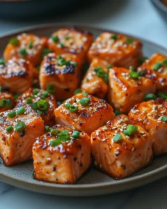Transfer the glazed salmon bites to a serving dish. For a touch of color and texture, sprinkle chopped green onions and sesame seeds on top. The green onions add freshness and a mild bite, while sesame seeds provide a subtle nutty crunch.