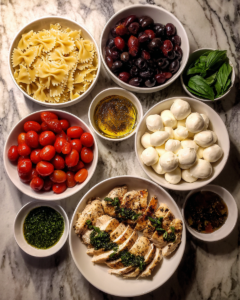 Italian Chicken Pasta Salad relies on a handful of simple ingredients that combine into a vibrant, balanced dish. Each component contributes texture, color, and flavor.