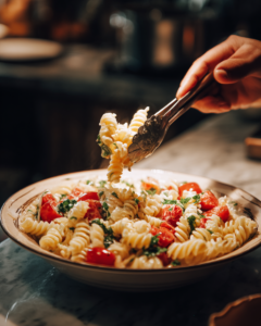 Short pasta shapes with ridges or curves perform best in Italian Chicken Pasta Salad because they capture the dressing and small ingredients. Rotini, fusilli, and farfalle remain popular options. Their structure holds bits of herbs, cheese, and vegetables so every bite contains balanced flavor. Penne and small shells also work well if those shapes are already available in the pantry. Very thin pasta such as spaghetti does not perform as effectively because the dressing slides off rather than coating the pasta evenly.