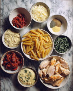 The ingredients in Marry Me Chicken Pasta Salad mirror the flavors of the classic creamy chicken recipe while adapting them into a chilled pasta salad format. Each ingredient contributes texture, flavor, and balance.