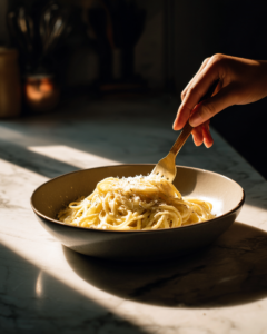 Parmesan cheese brings nutty saltiness and a creamy finish. Freshly grated Parmesan melts slightly into the dressing, helping create a silky coating on the pasta.
