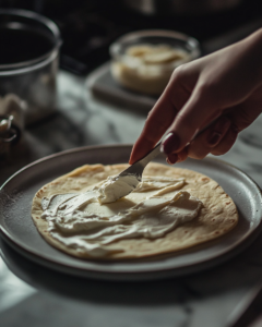 Lay one tortilla flat. Spread about 1/4 of the cream cheese mixture evenly across the surface, leaving about 1/2 inch (1 cm) border around the edges.