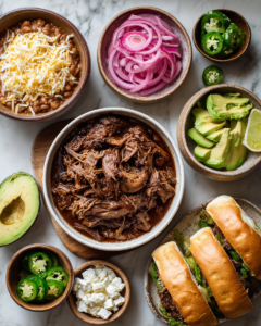 Tender chili-braised shredded beef layered on toasted rolls with fresh toppings for a bold, comforting sandwich.